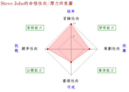 基本上,大家看到某人業務做得好,是看到「結果」,而不是看到他業務能力好的過程與原因,而這個服務分析的是你應該「怎麼把過程做好」然後「得到更好的結果」。比如「業務能力」好的人衝勁很強,他們不一定需要靠公關能力來獲得業績,被客戶拒絕時心情也很容易復原,比如賈伯斯就是這一類的人,他根本不在乎別人怎麼想,他只做他想做的事情。而且從圖上你會發現,他不是往下尖的圖,所以雖然他有研發背景,但是真正讓他發揮天賦的地方,並不是去研發什麼東西,而是指揮其他人去做研發的事情(統率能力)。