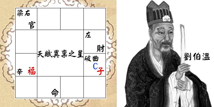 以蘇東坡而言,右弼在父母宮,左輔在交友宮,所以他沒有獨佔氣勢而與父親、兄弟在歷史上被人並稱「三蘇」。至於劉伯溫,左輔在財帛,右弼在官祿,相當於自己囊括了整個格局氣勢。所以兩人的格局相比而言,劉伯溫就顯得大器多了,即使原本就家世淵源,其他人的事蹟也被他的光芒給掩蓋,不太被後人著墨了。