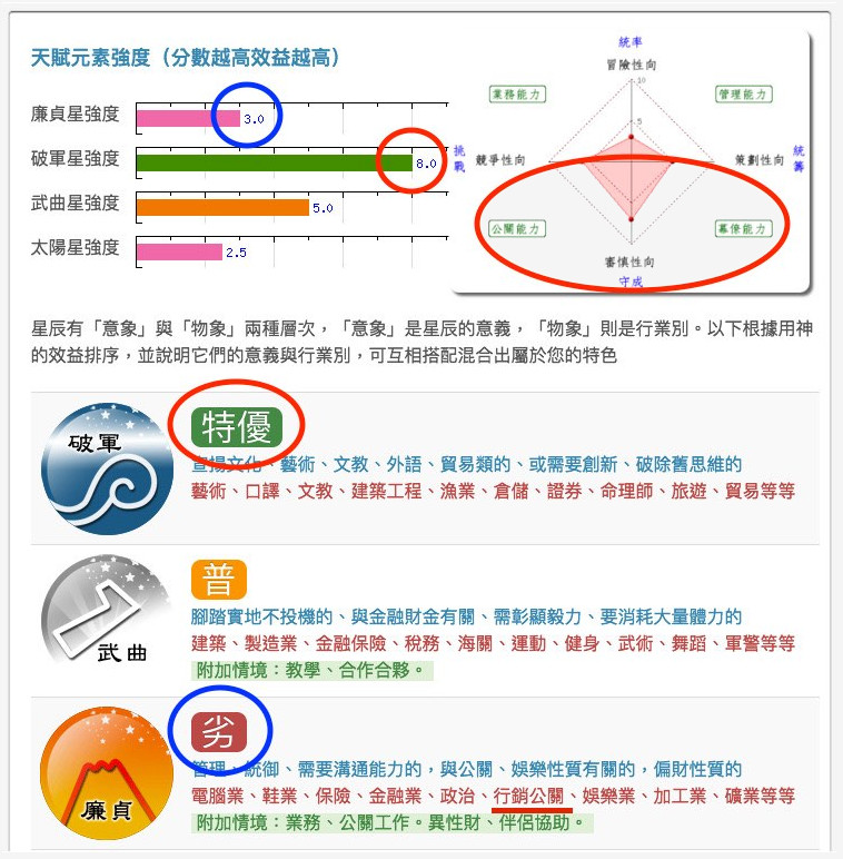 四象圖顯示「公關能力」好,但職業用神中的廉貞不優,卻也有個建議是「行銷公關」